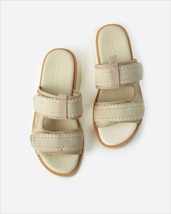 Introducing the Capri Slide, a stunning blend of style and comfort. This beige slide features a captivating two-toned upper with contrasting straps, adding a modern and dynamic touch to your look.