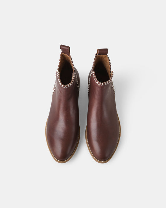 Presenting the Douglas Stitch Leather Boot, an elevated version of our customer's beloved year-round favorite ankle boot. This stylish footwear combines the familiar comfort of the classic silhouette with the added charm of blanket stitching detailing. The super easy and comfortable pull-on style remains a classic, crafted in a soft, timeless Chocolate leather.