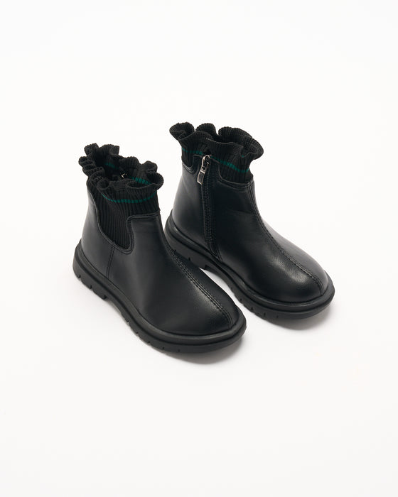 The Flora Boot is a stylish and versatile choice for your little one’s wardrobe. Crafted in sleek black faux leather, these boots feature a playful ruffle trim at the ankle for a fun and trendy touch. With an easy side zipper for quick on and off, these boots are perfect for both casual and dressed-up occasions. The cushioned sole provides all-day comfort, while the durable design ensures they’ll withstand plenty of adventures.