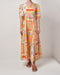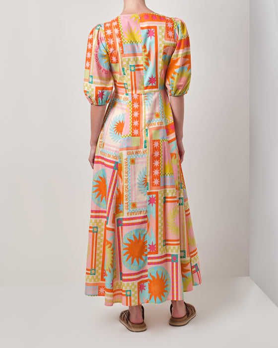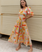 The Santorini Dress features a fitted bodice that gently transitions into a full-length, flared skirt. This maxi dress is elevated with delicate, statement cut-out details, offering a perfect blend of elegance and modern style.